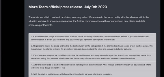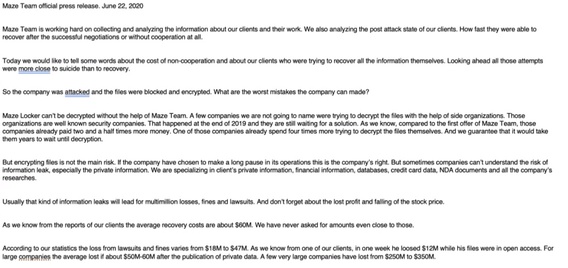 But some do not cooperate with the hackers. And those that do not often are faced with an explicit threat that the stolen data and information will be made public on the hackers' website. A heavily redacted version of a page by hacking group Maze shows various data dumps that can be accessed, as well as an accusation that a company is "trying to hide a successful attack on their resources."